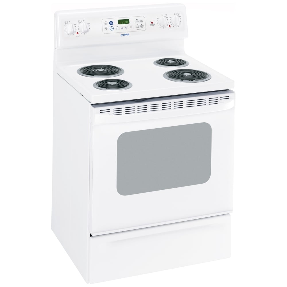 Moffat MCB757DMWW Electric Range, 5 cu. ft. Capacity, 30 inch Exterior Width, 4 Burners, Storage Drawer, Self Clean, 2,600 Watts Highest Burner Element, White colour.